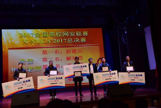 在过去的一天半中,20支来自国内各高校的网络安全精英战队在网络靶场中激烈鏖战,上演了一场精彩的攻防对决,最终诞生团队赛特等奖1名、一等奖2名、二等奖3名、三等奖5名;以及个人赛前五名、最佳指导老师5名。其中,信息工程大学f61d战队获得团队赛特等奖;南京航空航天大学Asuri2017战队队员张一白获个人赛第一名。同时,经大赛技术委员会综合评定,信息工程大学彭建山老师获最佳指导老师第一名。沈昌祥、方滨兴、陈国良院士及中央网信办、中国科学院、深圳市政府、中科院信息工程研究所、深圳大学等单位的领导为获奖团队和个人颁发了荣誉证书和奖金。