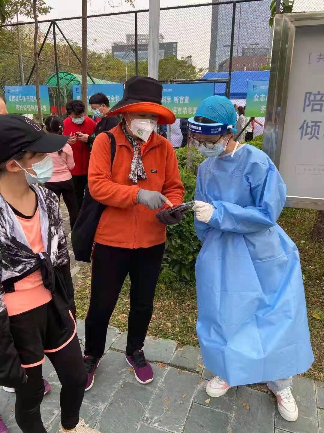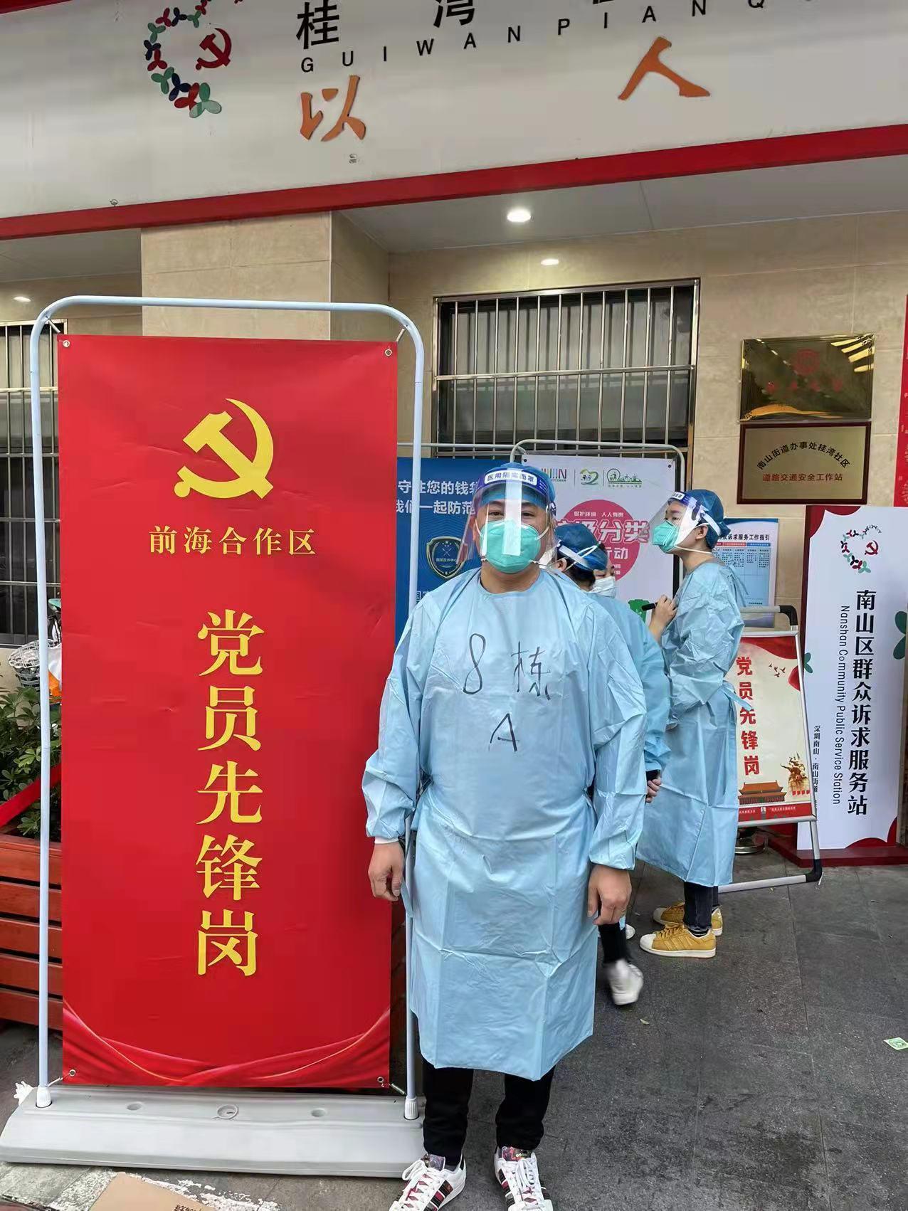 为支持街道防疫工作,信息中心党总支王苑芳、林巧庭、黄锐胜等党员老师主动请缨加入南山区桂湾社区、松坪社区等核酸检测点服务团队,助力一线防疫工作。各位党员志愿者在做好个人防护的同时,统一接受指挥调度,协助医护人员进行场地布置、引导提醒、查码测温、扫码登记、信息录入、车辆人员引导等,井然有序、有条不紊地协助开展核酸检测工作,维护现场秩序。