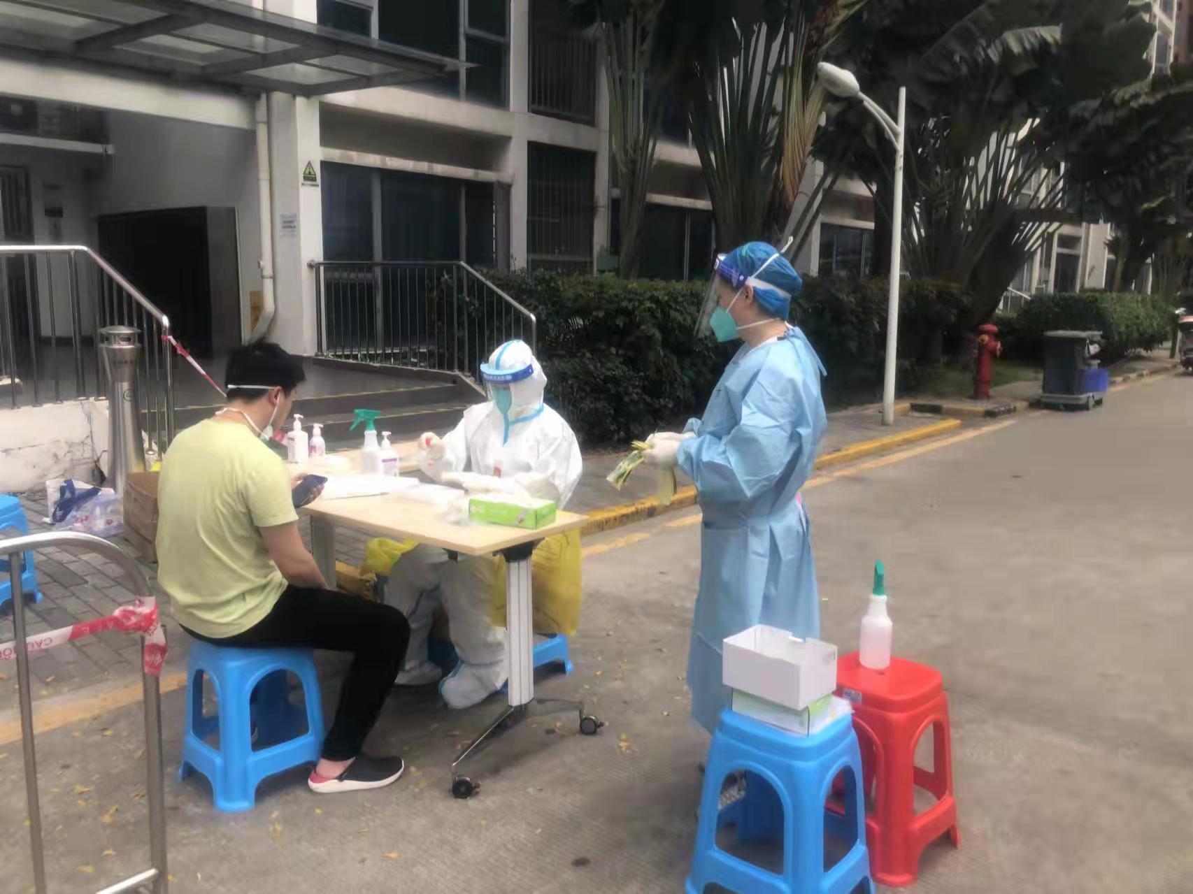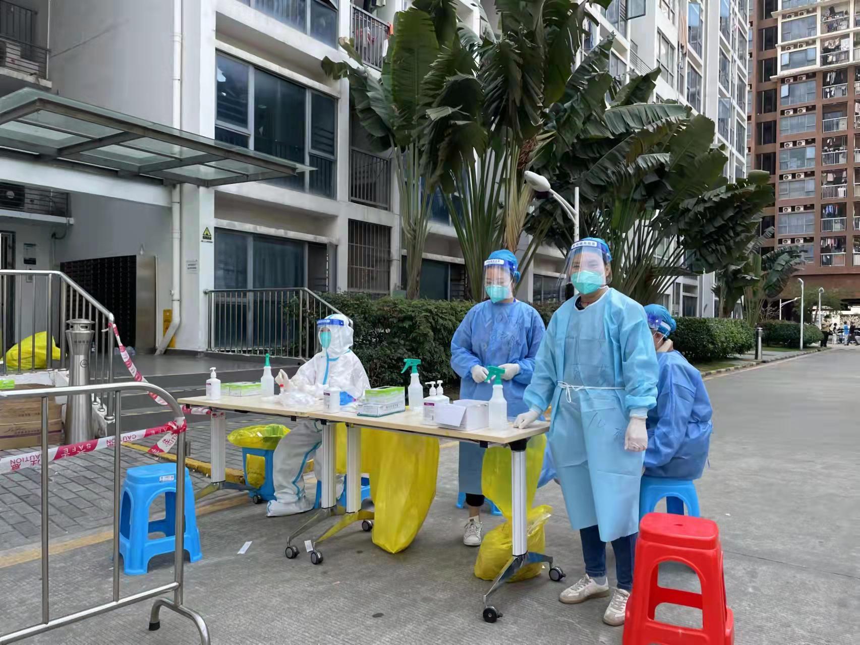 为支持街道防疫工作,信息中心党总支王苑芳、林巧庭、黄锐胜等党员老师主动请缨加入南山区桂湾社区、松坪社区等核酸检测点服务团队,助力一线防疫工作。各位党员志愿者在做好个人防护的同时,统一接受指挥调度,协助医护人员进行场地布置、引导提醒、查码测温、扫码登记、信息录入、车辆人员引导等,井然有序、有条不紊地协助开展核酸检测工作,维护现场秩序。