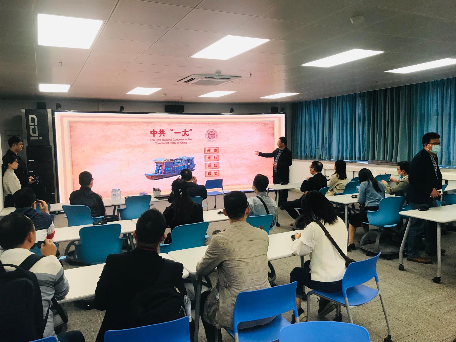 在互动环节,来自协会的企业界人士一一作自我介绍,简要介绍各自的公司及其业务和产品情况,并观看了某公司研发的VR互动娱乐产品,以及由王志强教授带领研究生团队研发的《中共“一大”》和《井冈山根据地》VR课件演示。