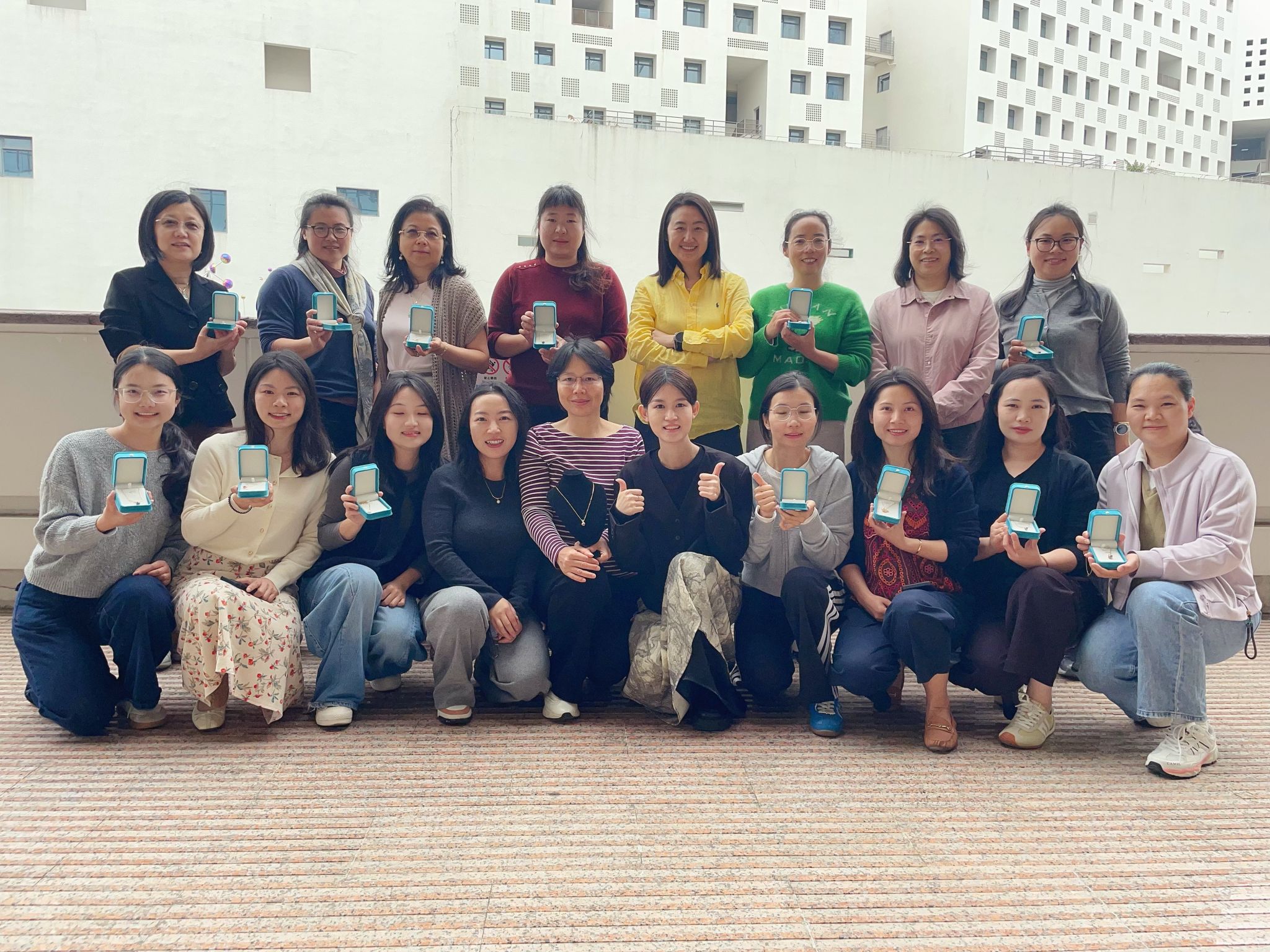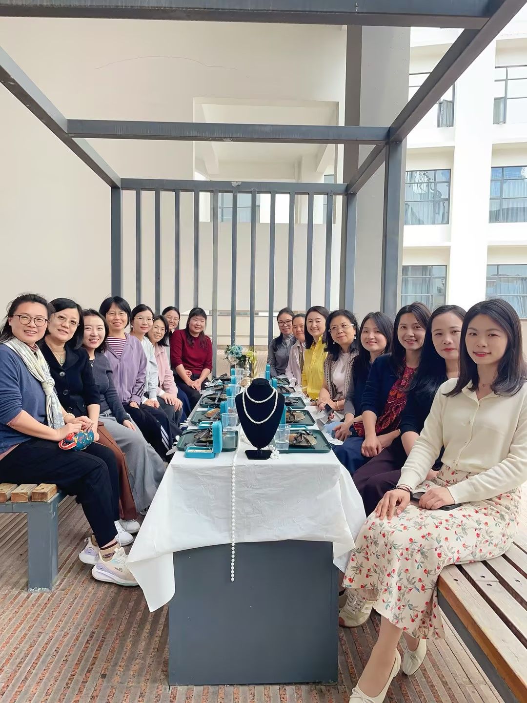 大家全神贯注,将一颗颗温润的珍珠从蚌肉中取出,再擦洗、打磨、钻孔,随后挑选自己喜欢的项链,将珍珠镶嵌上去。原本普通的项链,在配上开出的珍珠后,瞬间变成了一件很有意义的首饰,一颗颗晶莹夺目、独一无二的珍珠,恰如女教职员工此刻的精神状态,每一位都散发出独特的魅力。大家相互展示着自己的珍珠项链,分享着开蚌时的惊喜与制作时的巧思,现场洋溢着温馨快乐的氛围。