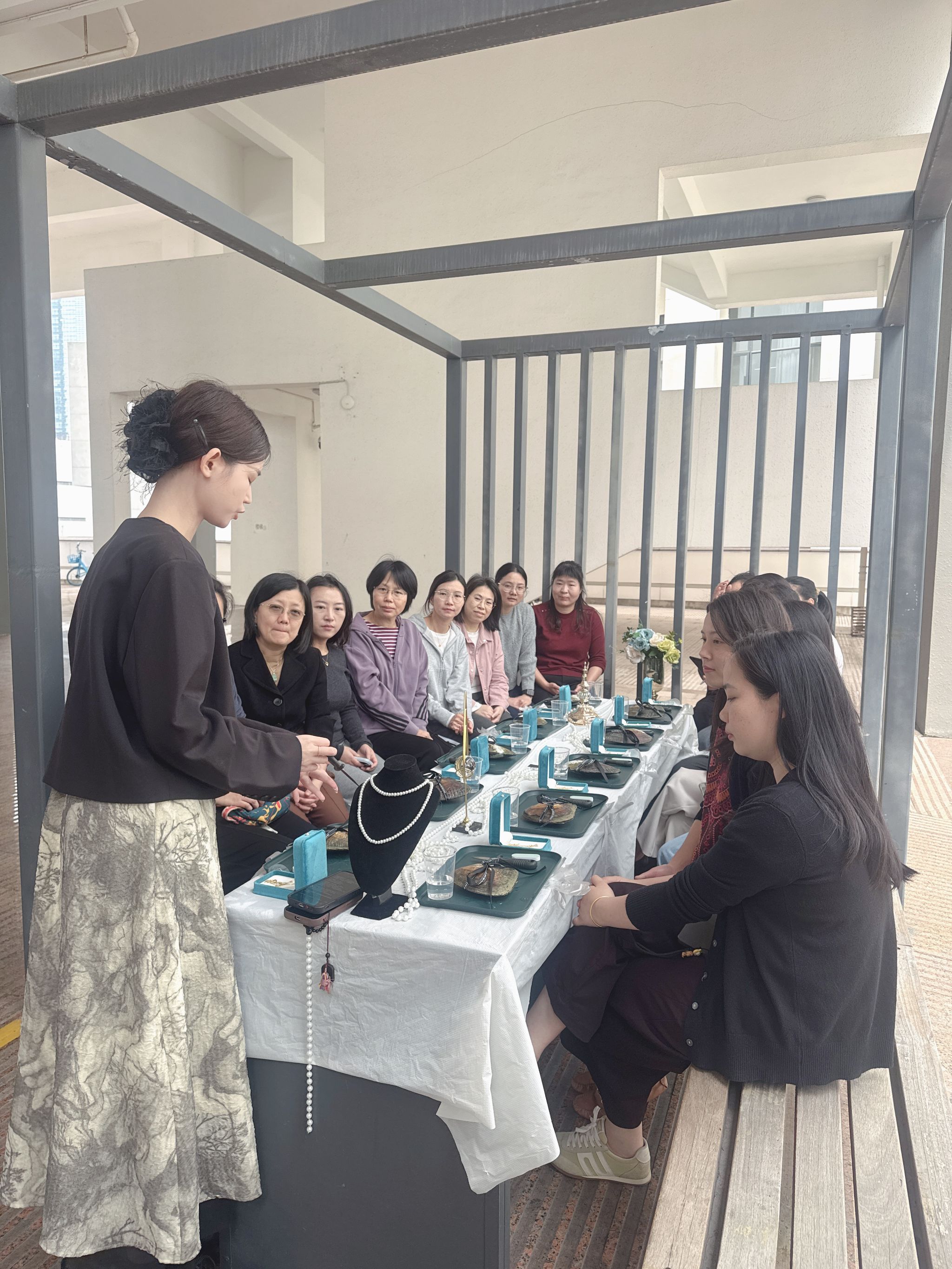 大家全神贯注,将一颗颗温润的珍珠从蚌肉中取出,再擦洗、打磨、钻孔,随后挑选自己喜欢的项链,将珍珠镶嵌上去。原本普通的项链,在配上开出的珍珠后,瞬间变成了一件很有意义的首饰,一颗颗晶莹夺目、独一无二的珍珠,恰如女教职员工此刻的精神状态,每一位都散发出独特的魅力。大家相互展示着自己的珍珠项链,分享着开蚌时的惊喜与制作时的巧思,现场洋溢着温馨快乐的氛围。