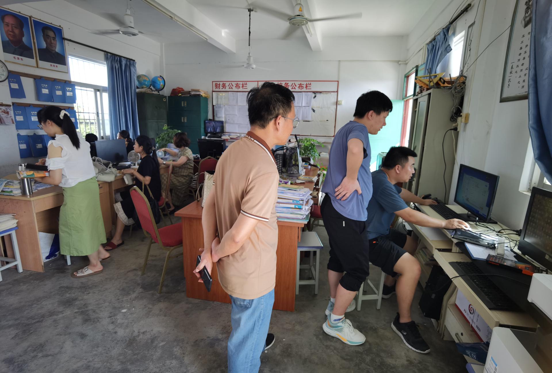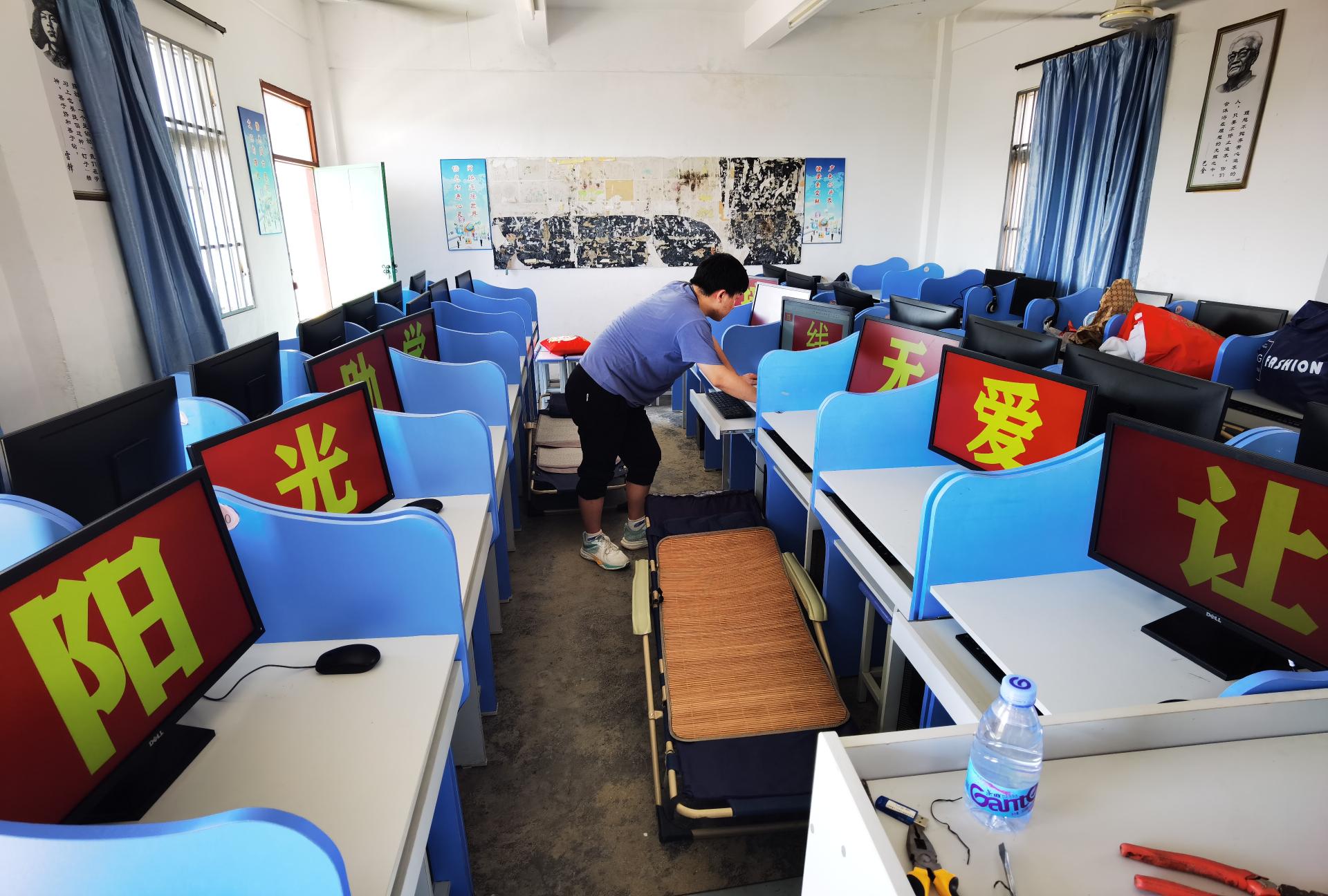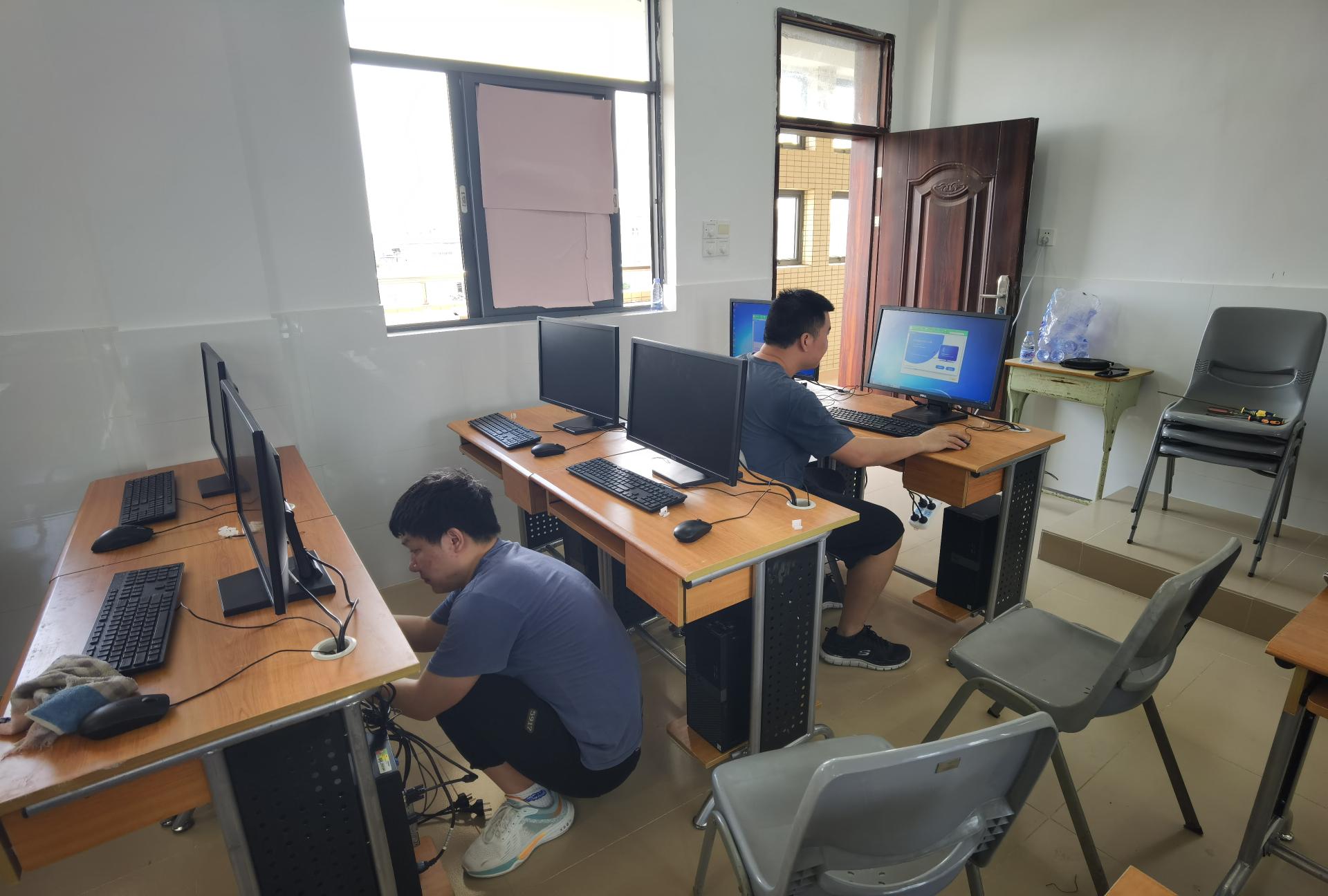 在双塘小学和后湖小学,帮扶队员们打扫教室、擦拭桌椅、布线接线、安装电脑、测试系统、优化系统,一连串的步骤环环相扣,一个个动作看起来都那么驾轻就熟,无不体现着工程师们对帮扶的热忱和专业的素养。两天的时间队员们都在紧张、忙碌中度过,身上穿的T恤被汗水一次次湿透。