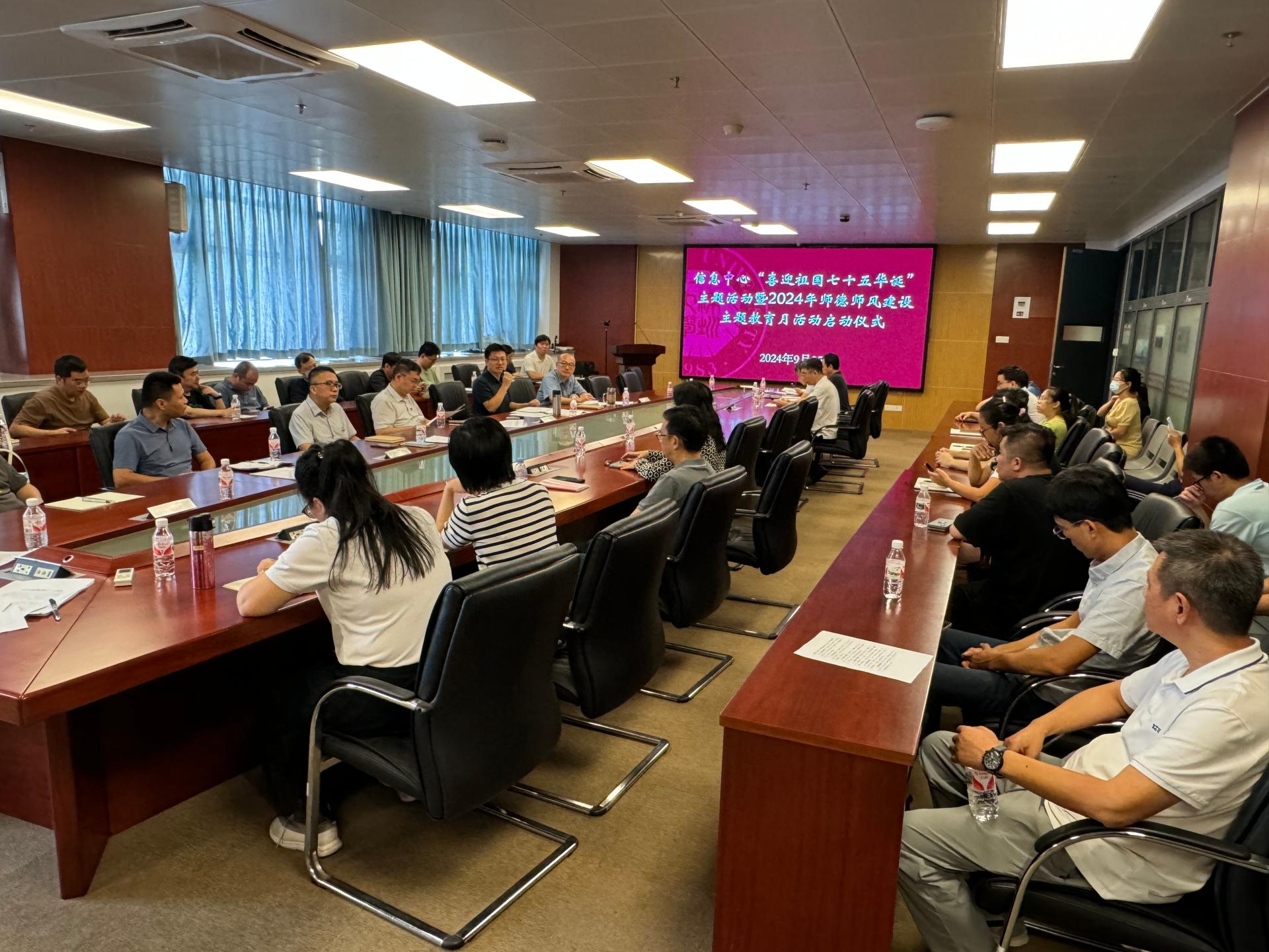 2024年9月25日上午,秋高气爽,阳光明媚,在新中国成立75周年来临之际,信息中心全体教职员工齐聚一堂,隆重举行“喜迎祖国七十五华诞”主题活动暨2024年师德师风建设主题教育月活动启动仪式。活动由中心总支书记秦斌主持,中心主任陈昊、副主任钱恭斌、江魁以及全体教职员工近80人参加了活动。