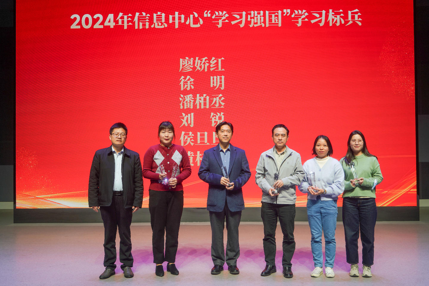 会上颁发了“学习强国”学习标兵奖和“团结奋斗奖”。“学习强国”学习标兵奖用于奖励过去一年“学习强国”平台学习中孜孜不倦、勤奋好学的先进个人,激发党员同志不忘初心、践行使命的内生动力,获奖者是廖娇红、徐明、潘柏丞、刘锐、侯旦旦、黄桂婷。“团结奋斗奖”用于表彰过去一年中心各部门涌现出来的团结协作、奋发进取、忠诚履职、挺膺担当的先进个人,获奖者是软件与数据资源部陈锦繁、徐明,综合办公室陈伟婵、胡凯峰,网络与安全技术部伍波、王宽锋,视听技术部邓秉忠,信息服务部侯旦旦、黄桂婷,创新教学管理部刘锐,粤海校区运维部戴劲、林喜群,校园卡应用管理中心刘佳敏,丽湖校区运维部陈旭琳、张海华。