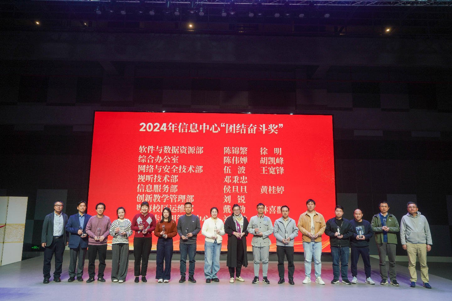 2024年1月10日下午,信息中心在粤海校区STUDIO演播大厅隆重举行2024年度表彰大会,中心领导陈昊主任、秦斌书记、钱恭斌副主任、江魁副主任以及全体教职员工70余人参加了大会。