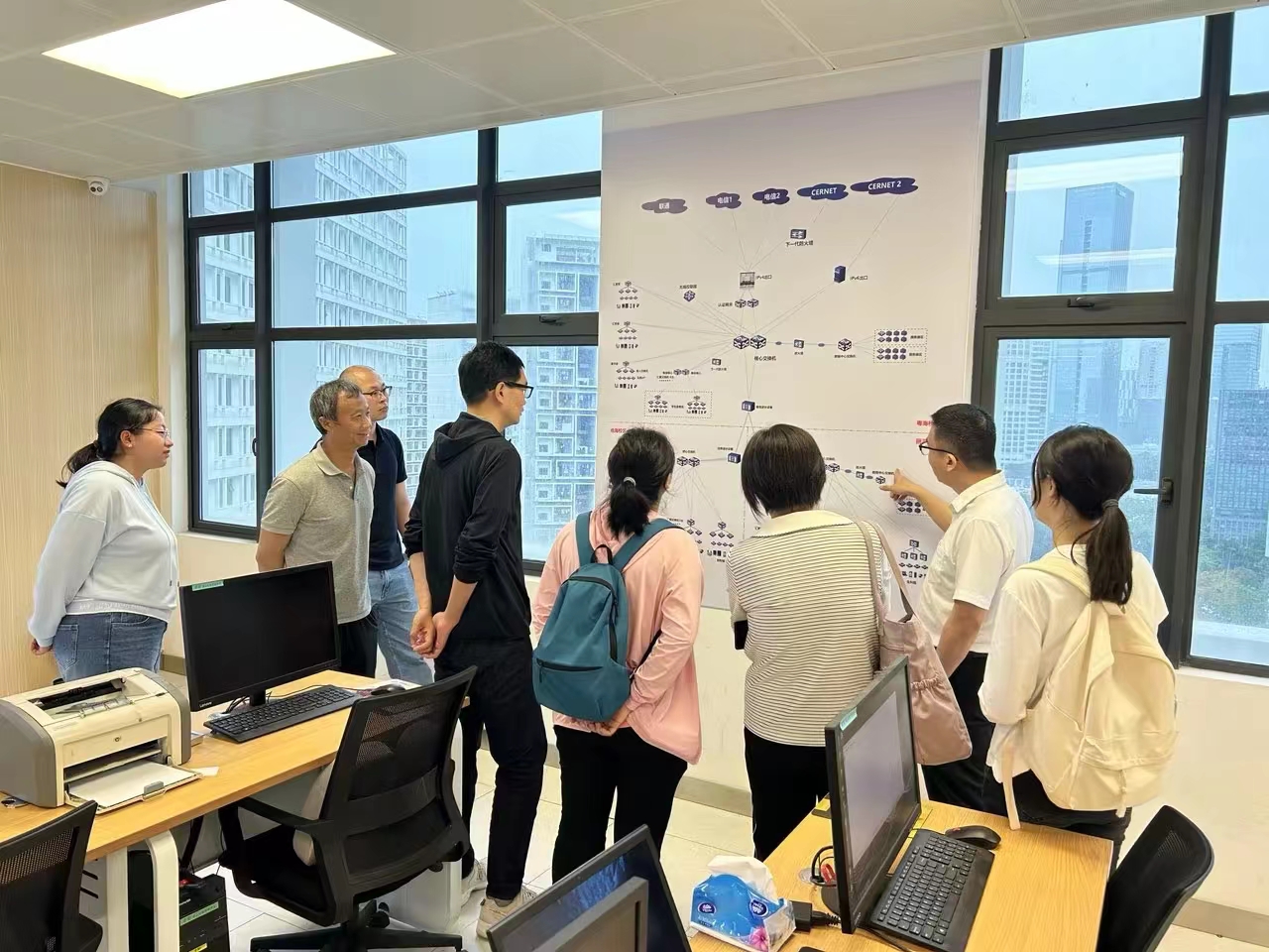 宾主双方进行了轻松友好的交流,就相互感兴趣的内容进行交谈和深入了解。最后江魁副主任陪同庞飞一行参观了我校位于致理楼的数据中心机房。