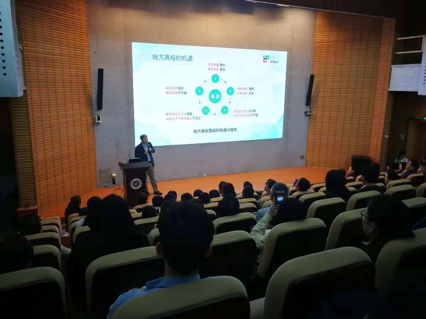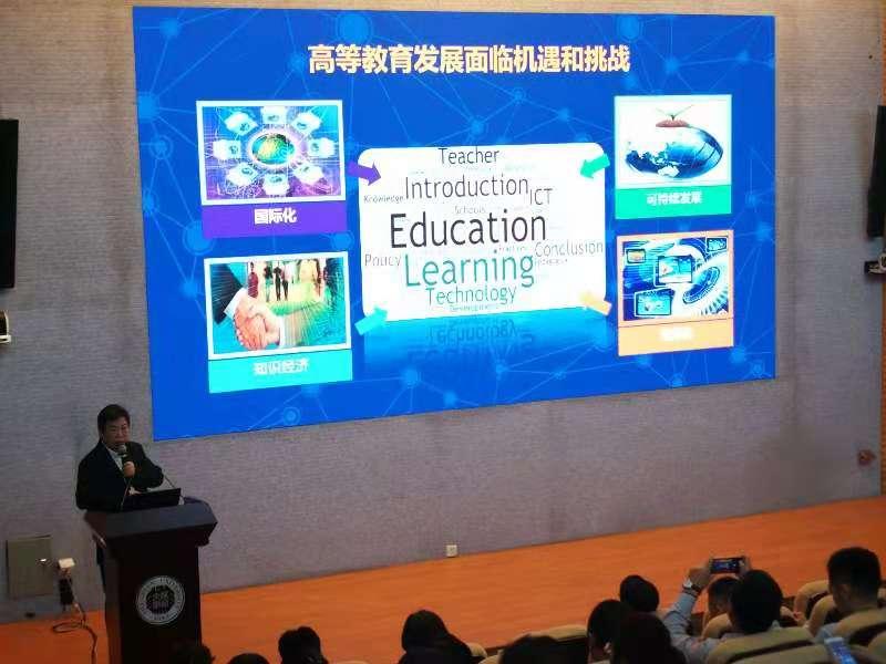 紧接着由UOOC联盟理事长、深圳大学校长李清泉教授致辞并作联盟成果汇报,李校长向远道而来的专家、同行和与会嘉宾表示了诚挚的欢迎和衷心的感谢。李校长的报告《全国地方高校UOOC联盟的探索与实践》以我国的教育信息化发展战略作开篇,从全国教育大会精神讲到了教育信息化2.0行动计划,再到新时代全国本科教育工作会议,他说当前信息技术和智能技术深度融入教育全过程,教育信息化正从融合应用走向创新发展,从而推动课堂教学革命,重塑着教育教学形态。回顾过去的几年,在全国许多地方高校中,教学资源紧张、优质课程短缺、优秀师资不足的问题比较突出,发展很不平衡,在这种形势下,深圳大学联合部分国内地方高校,发起成立了全国地方高校优课联盟,抱团取暖,实现优质教学资源共享。联盟的使命是服务地方高校,促进高等教育均衡化发展,联盟的宗旨是共建共享、学分互认、提升质量、服务社会,联盟的理念使开放、共建、共享、共赢。李校长跟与会代表回顾了优课联盟从筹建到起步再到发展壮大的历程,分享了联盟从课程到平台、机制、评价,再到培训、研究的“六位一体”的建设体系,联盟成立4年多来,不仅自主研发了课程平台,还建立了一系列管理运行机制和课程质量评价体系,构建了多维培训体系,从而破解地方高校教学理念与方法滞后,信息技术与教学融合不够的难题,通过运行模式创新,创建联盟、学校和企业三方合作的可持续发展运行模式;通过应用机制创新,创建“线上线下一体化”的跨校教务管理协同机制;通过评价创新,创建立体化在线开放课程评价体系。接着李校长总结了优课联盟已取得的成果,包括带动了上百所地方高校建设和应用在线课程;大规模提升了地方高校的教师信息化素养,推动了教学模式创新;跨时空的个性化学习,培养了学生的自主学习与终身学习能力;多广度公益服务,60多家媒体先后进行专访和报道;多类型研究成果突出,先后获得广东省教学成果特等奖和国家教学成果二等奖。最后,李校长对优课联盟的未来做了展望,优课联盟未来将在先进技术应用、职业技术培训、优质课程挖掘、开放共享平台、课程推广应用、学分互认机制和可持续发展模式等方面,做出更深入的探索和更持久的努力。李校长的报告视野宏大,纵横捭阖,获得与会者的热烈反响。