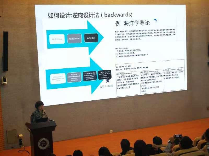 对于许许多多奋战在慕课一线的学科教师来说,慕课该如何进行教学设计,如何规划混合式教学方法,大会还请到了北京大学数字化学习研究中心主任、教育部“教学信息化与教学方法创新指导委员会”委员、教育部高教司在线开放课程项目专家组成员汪琼教授进行传经送宝,汪教授近五年致力于组织建设教师能力提升慕课质量,所在团队已开设4门慕课,其中“翻转课堂教学法”获2017年国家精品在线开放课程称号。汪教授介绍了混合式教学的特点、优势以及原则,从三个关键点:了解onsite和online各自的优势、重新设计课程、学生支持展开,给与会代表着重讲解了混合式教学设计的方法,如逆向设计、翻转设计、迭代设计等,介绍了混合式教学应用的三种模式,分别是掌握学习模式、技能训练型课程和研究型课程。