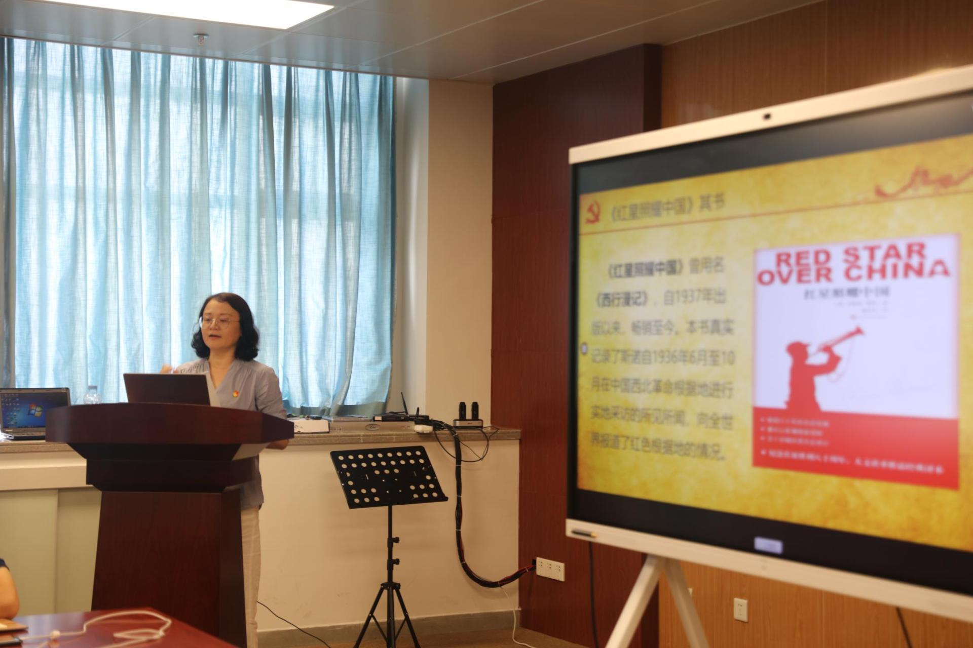 邱妙芳的党课围绕三方面的内容展开,一是《红星照耀中国》作品介绍;二是作者以及来到中国采访和写作的时代背景介绍;三是书里所写的那些照耀中国的"红星"。党课以图文并茂的形式和生动丰富的内容讲解吸引了全体党员。