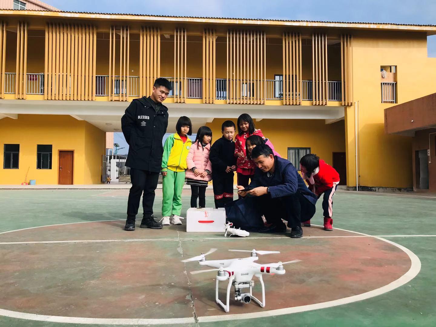 大家来到曲潭小学,代表中心党总支30位党员的心意,向曲潭小学师生赠送了60套学习用品。中心工程师们开始了紧张的检修工作,将大屏触控一体机和电脑、无线网络设备的故障一一排除;创客志愿者们带来了大疆无人机,和孩子们一起进行飞行操控体验,讲解无人机飞行知识,航拍曲潭村和曲潭小学。通过无人机镜头,大家欣喜地看到一个崭新的曲潭村村貌展现在面前,一栋栋小楼拔地而起,很多家庭住起了小楼房。由深大援建的曲潭小学,造型设计独特,金黄的墙面在太阳的映照下格外亮丽、抢眼。