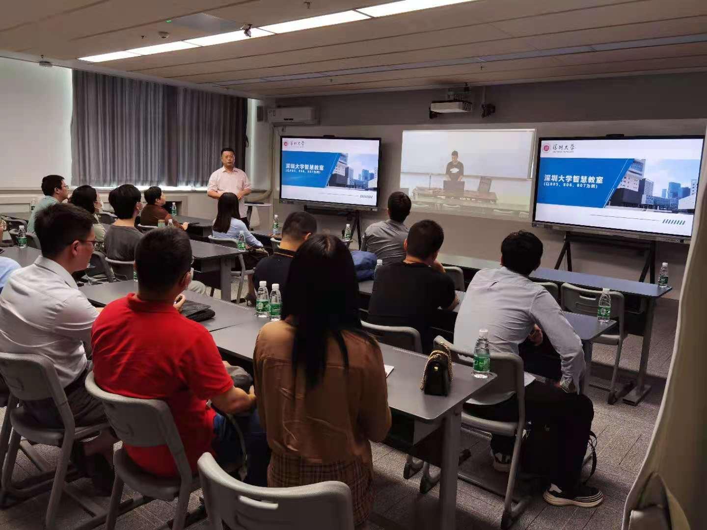 王志强主任致欢迎辞,就此次活动的主旨做了说明。他向来宾们介绍了我中心智慧教室建设目前已取得的阶段性成果,在远程互动教室、分组研讨教室以及虚拟仿真教室分别作了现场讲解,并就研究生团队开发的《中共一大》、《井冈山根据地》VR课件做了详细演示。王志强主任还谈到建设“云端深大”的构想,指出线上+线下的混合式教学、自适应个性化学习将成为未来高校的主流教与学方式。