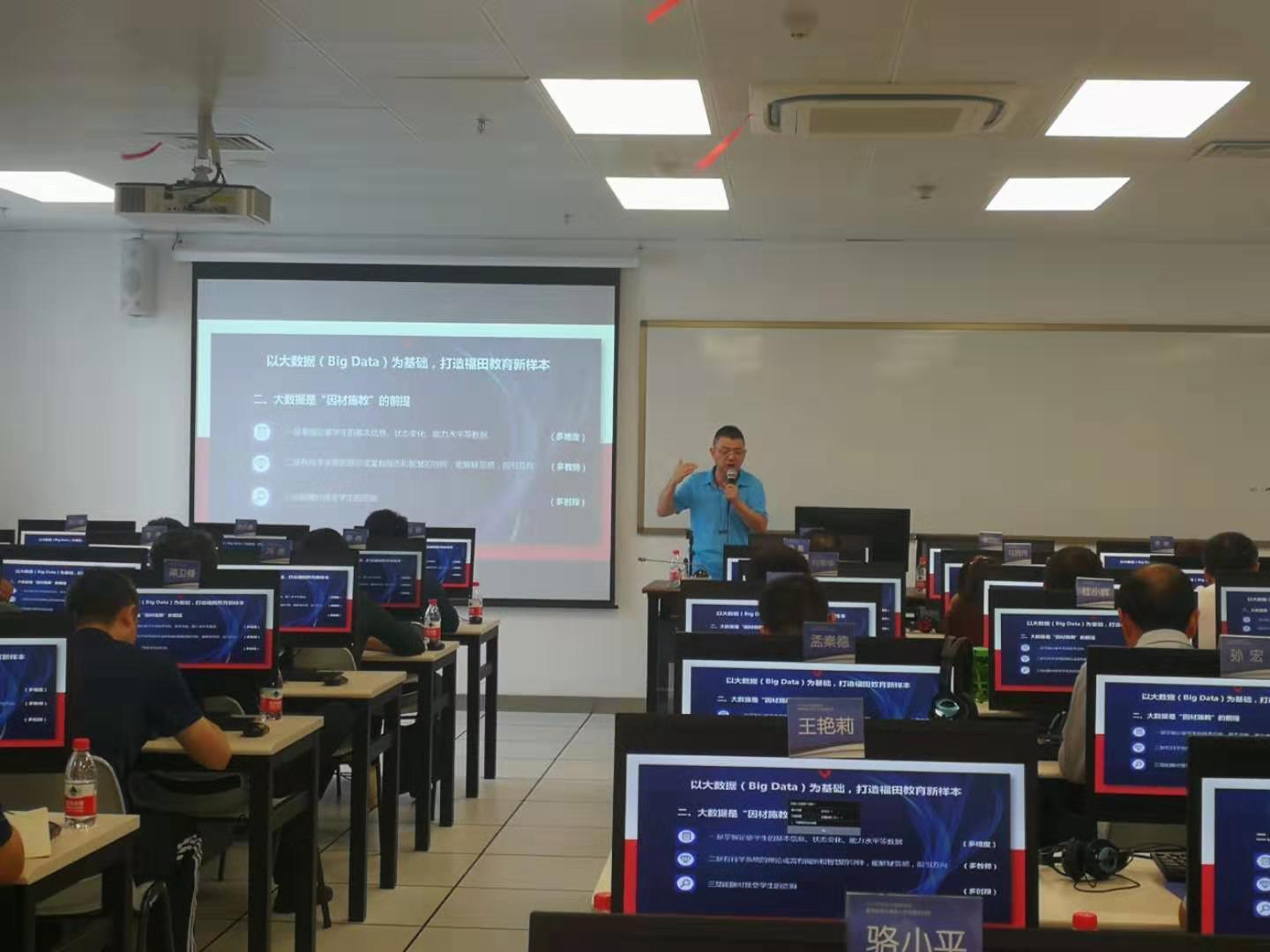 培训班首先邀请了福田区教育局教科院信息技术研究部张健部长作题为《依托ABC+区块链新技术,打造福田AI赋能能教育新天地》的报告,张健主任从近几年热门的ABC+区块链讲起,分享了深圳市福田区的教育信息化建设思路、指导思想和具体的做法,主要包括对技术的理解和整合运用的能力、基于大数据的一心六云以及基于混合云的福田教育网络拓扑结构等内容。