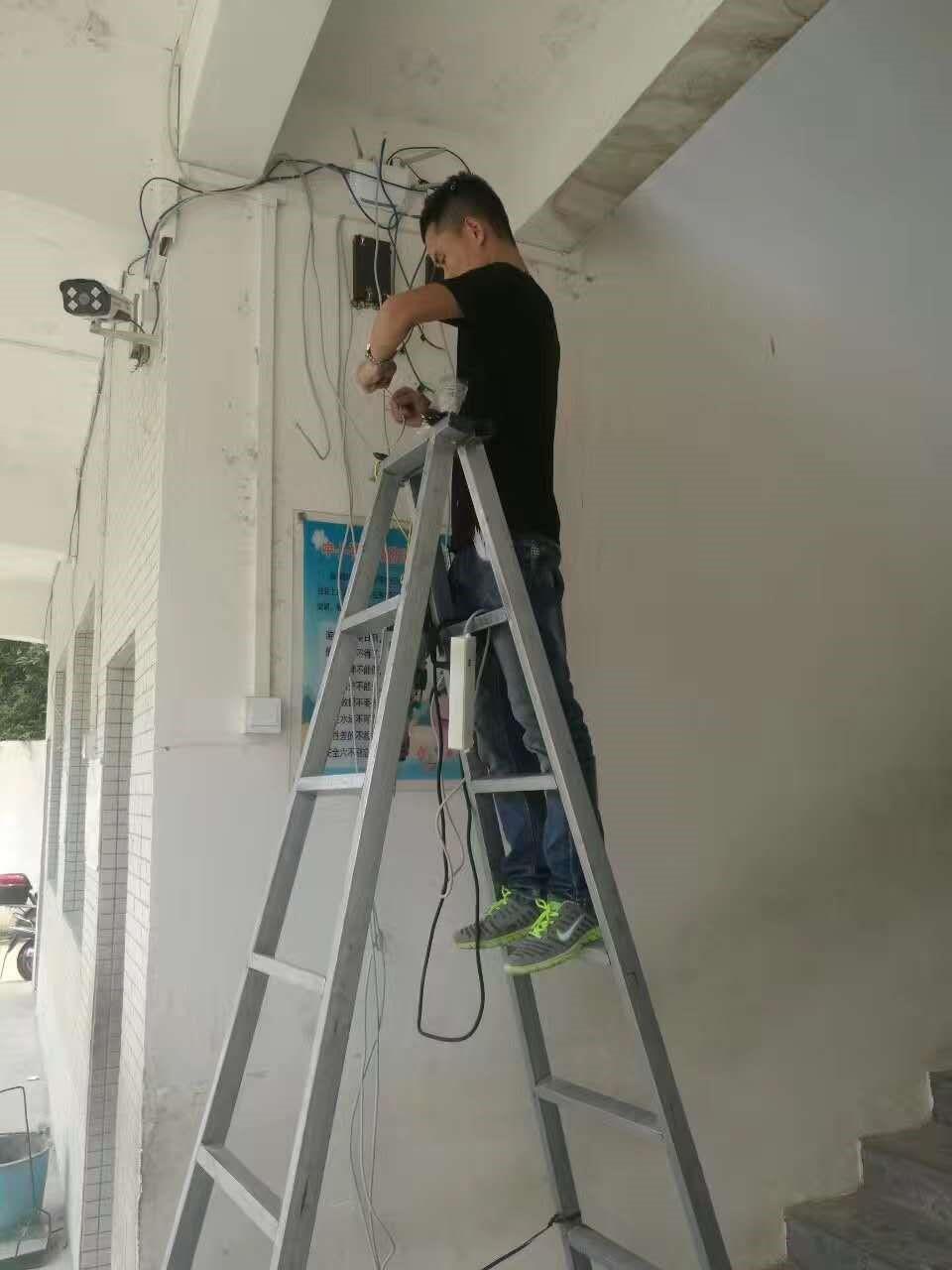▲工作人员正在安装一体机和网路布线