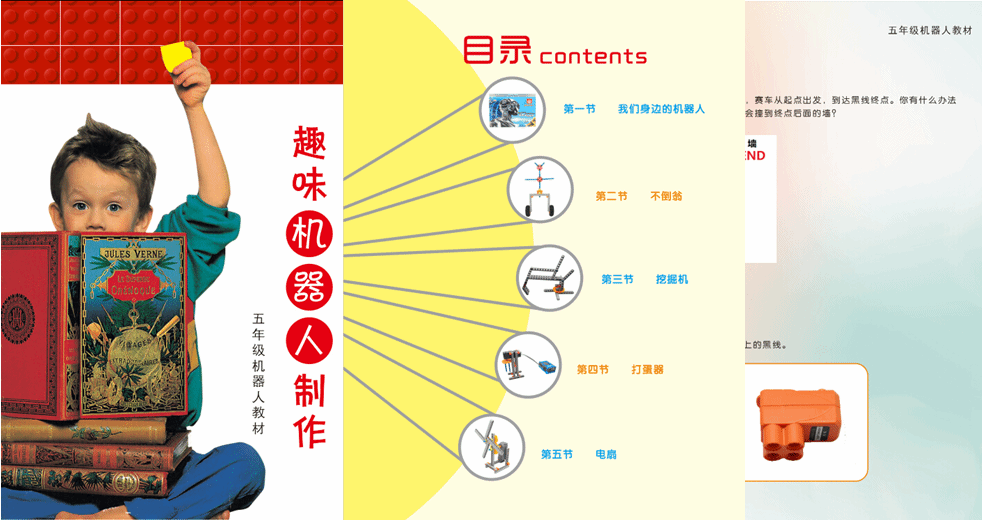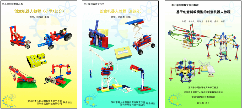 2015年,徐明创客教育工作室利用自主开发的创客教育智能控制套件和自主设计和3D打印的创意机器人转接连接套件,在几所基地学校进行了教学实践,开发了几套创意机器人校本教程: