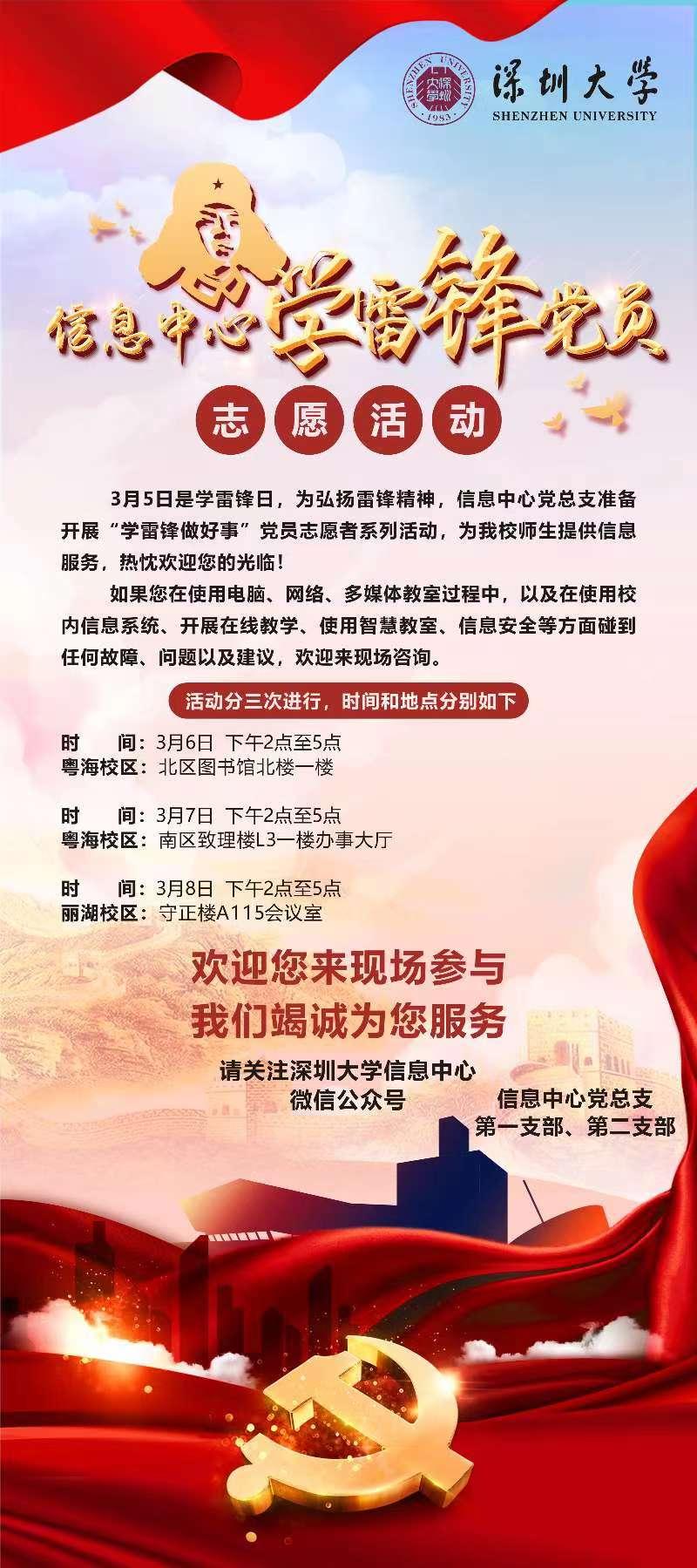 3月5日是学雷锋日,为弘扬雷锋精神,信息中心党总支准备开展“学雷锋做好事”党员志愿者系列活动,为我校师生提供信息服务,热忱欢迎您的光临!