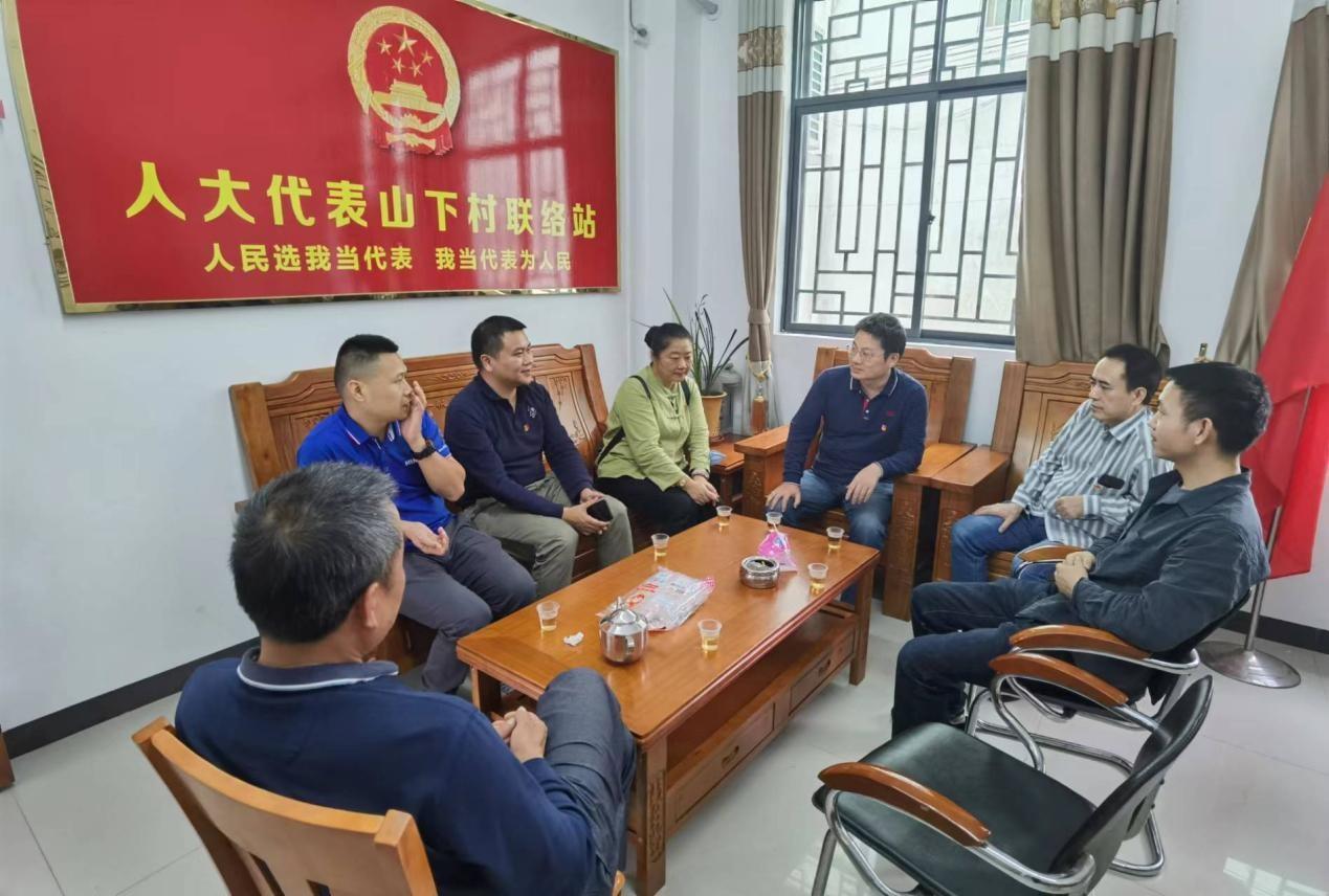 帮扶小分队来到山下村党群服务中心,只见对面的墙壁上书写着习近平总书记对全党的谆谆教诲“人民对美好生活的向往,就是我们的而奋斗目标”,两行红色的大字分外耀眼夺目。在会议室,秦斌与深大驻村干部杨建、杨振宇、汪江和当地村镇干部座谈,详细了解山下村的党建和乡村振兴工作,为深圳大学前几年已经取得的扶贫成果感到由衷的高兴,为乡村建设献计献策,如开辟露营地、利用村民现有空余住房开发民宿、大力发展番薯种植和淡水鱼养殖、垂钓等等,纷纷出点子。