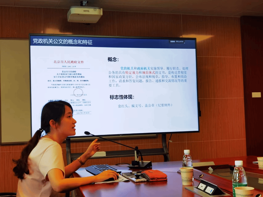 付妍的公文写作主要讲解了公文的概念、常见公文的种类,介绍了通知、报告、纪要、公函、请示等五种常见的公文写作的格式要求,并分别进行了举例说明,最后她还分享了自己的写作心得,如善于概括、善于拔高、善用排比、善用细节,注意逻辑、文风简洁等方面。一节很接地气的中文写作课,台上的人讲得认真,台下的人听得仔细,也初步展露了付妍科班出身的中文功底,可谓小荷才露尖尖角。