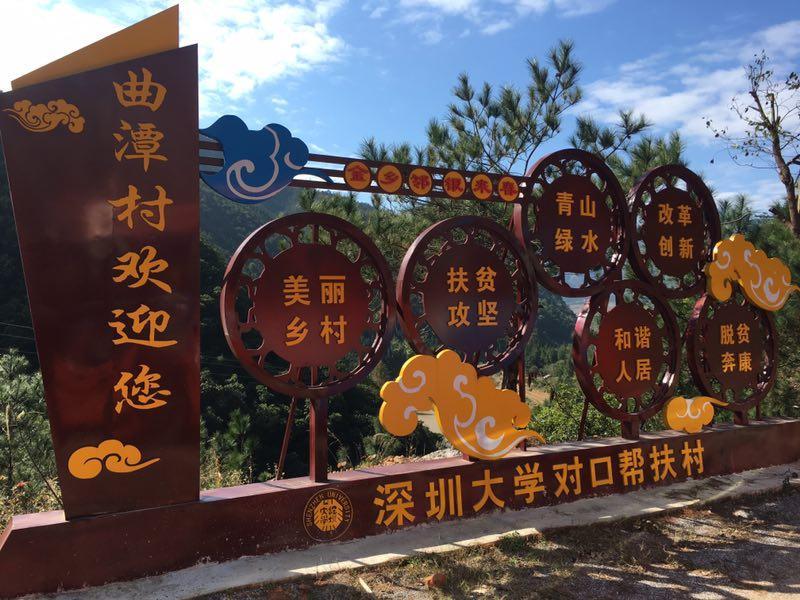 扶贫小组带着中心全体教职员工的深情厚意,经过长途跋涉,再一次踏上了曲潭村的土地。到了村口,一座“曲潭村欢迎您”的巨型宣传牌矗立在路旁,上面写着“美丽乡村”、“脱贫攻坚”、“青山绿水”、“改革创新”、“脱贫奔康”、“和谐人居”等扶贫目标和发展愿景,充分展现了曲潭村人民对未来美好生活的期盼,也是深圳大学全体师生的共同心愿。