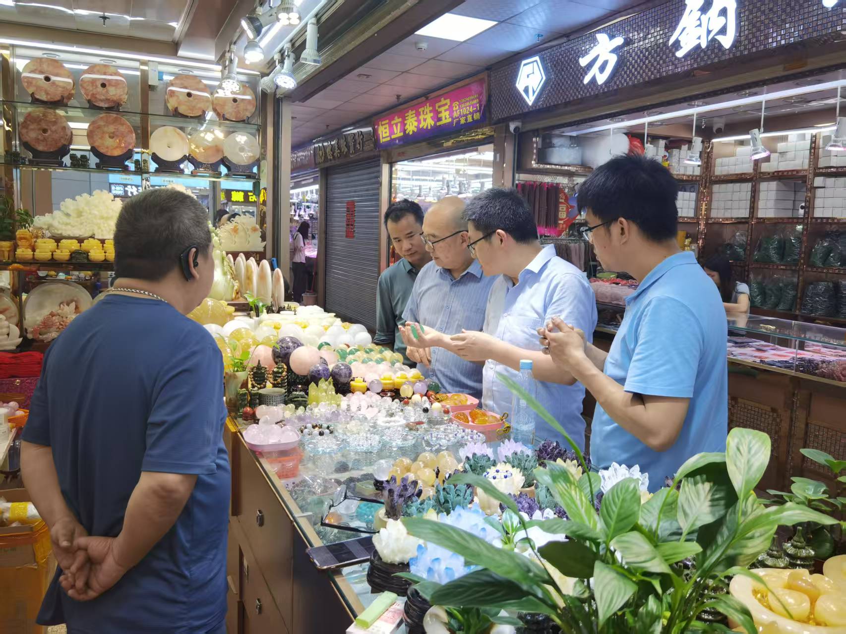 秦斌一行在驻县服务队林志雄队长的陪同下,首先来到了可塘镇珠宝交易市场考察调研,只见市场内各种珠宝产品琳琅满目,让人目不暇接,珠宝品类极为丰富,来采购的人络绎不绝。据了解,该市场成立于2004年,集“产、供、销”为一体,总占地面积14万多平方米,自成立以来,吸引3000多家企业入驻,远销全球,成为全国最大的珠宝加工集散地,占全世界有色宝石的70%以上份额,为珠宝供应链提供极富性价比的产品。