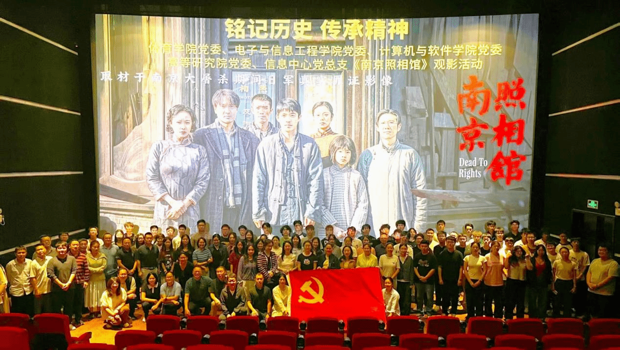 为纪念中国人民抗日战争暨世界反法西斯战争胜利80周年,弘扬爱国主义精神,提升思想政治教育的时代性与感召力,10月30日,体育学院党委、电子与信息工程学院党委、计算机与软件学院党委、高等研究院党委和信息中心党总支五个单位联合举办《南京照相馆》观影活动,共计107名师生参加。