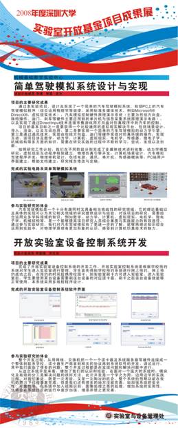 项目名称:简单驾驶模拟系统设计与实现 项目负责人:李镇 指导教师:娄燕 立项年度:2008年度 项目名称:开放实验室设备控制系统开发 项目负责人:李国强 指导教师:程涛 立项年度:2008年度 |