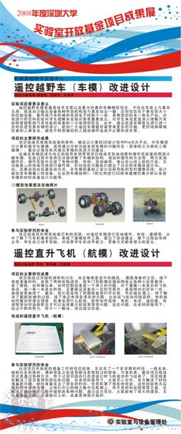 项目名称:遥控越野车(车模)改进设计 项目负责人:胡启能 指导教师:王华权 立项年度:2008年度 项目名称:遥控直升飞机(航模)改进设计 项目负责人:邓径 指导教师:王华权 立项年度:2008年度 |