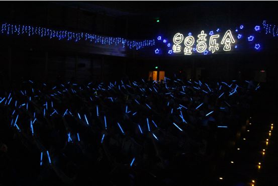(音乐会现场台下观众挥舞着蓝色荧光棒)