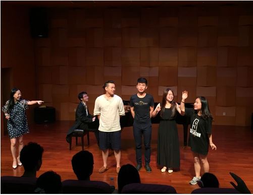 互动环节,主持人现场邀请4个观众(均为我院学生)上台进行听演奏猜曲目PK和进去流行歌曲演唱。