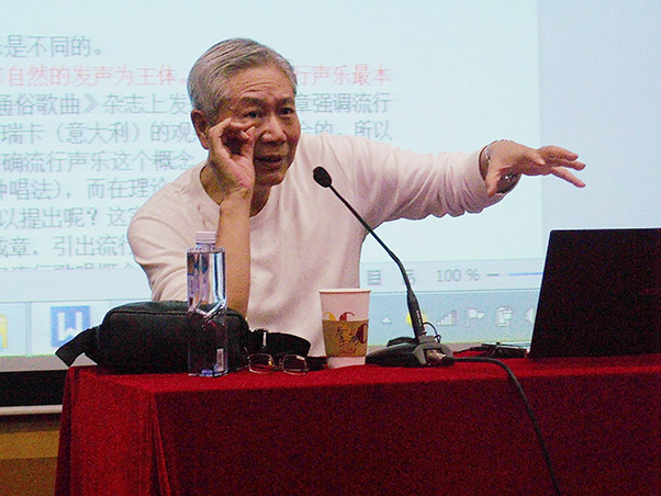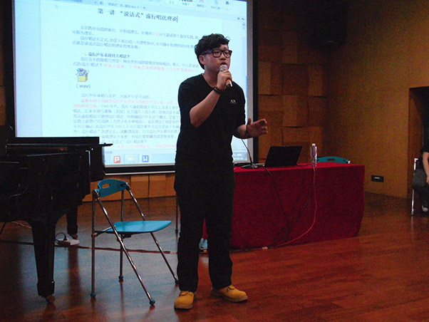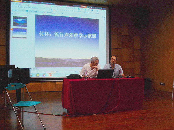 付林老师从一篇命名为“说话式流行演唱理论”开展教学,由从“中国好声音”脱颖而出的吴莫愁、及“汪峰式”唱法的李龙、两位乐坛新人作为例子进行教学,进而解释了“说话式”的真正意在“回归本质”。付林老师特别忠告同学们要保护好自己声音的本质,也说到在歌曲中对声音张力的把握,张力过大也是不可取的。
