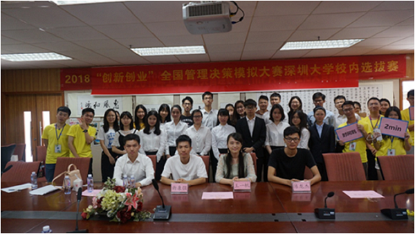 2018年5月13日上午,由深圳大学管理学院主办、ERP俱乐部承办的2018年“创新创业”全国管理决策模拟大赛深圳大学校内选拔决赛于管院院办1400会议室举行。本次比赛邀请到往届尖烽时刻优秀国赛选手王一帆、陈龙杰、李沛以及谢康强师同学莅临比赛现场并担任评委。
